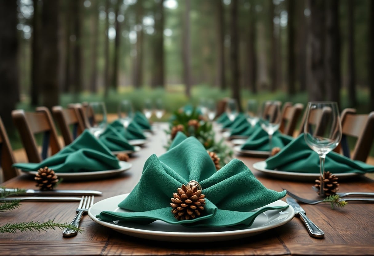 Bei der Schaffung eines rustikalen Ambientes sollte nicht unterschĂ€tzt werden. Denn Sie können mit Hilfe von Licht Ihre WaldgrĂŒn-Servietten noch betonen und Ihre GĂ€ste in die Natur entfĂŒhren.